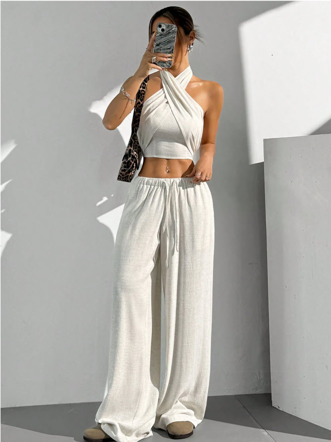 ست 2 تایی نیم تنه پشت باز پشت گردنی و شلوار گشاد بلند کمر کش و بنددار
