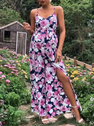 لباس بارداری با گلدوزی گلها، یقه متقاطع و کمربندی