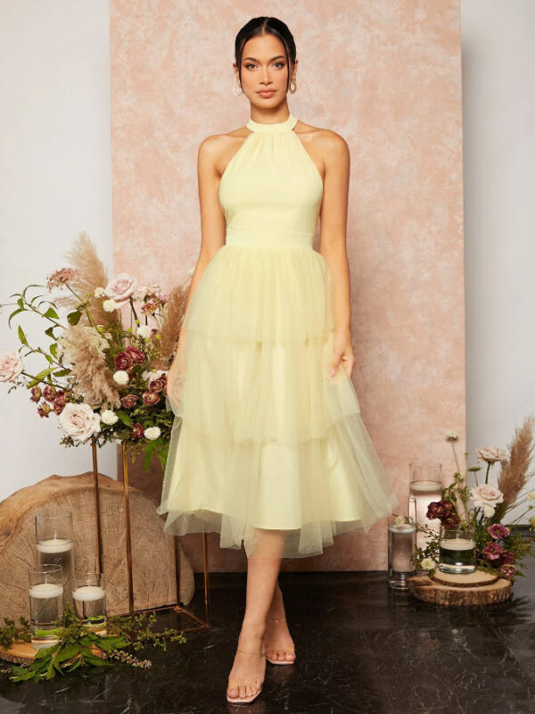 لباس با قسمت جلویی متقاطع، بندی در جلو، گردنی هالتر، پشت باز و جمعشده با بریده در قسمت ران