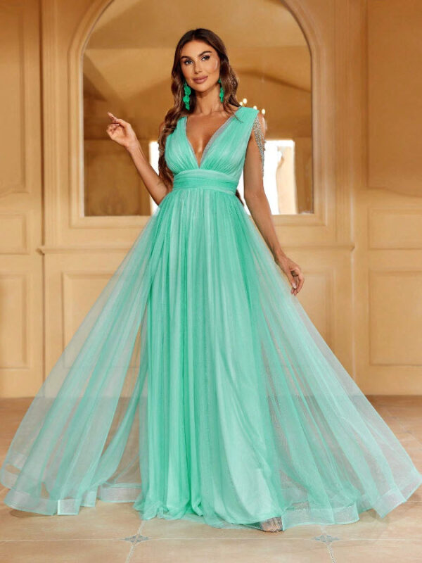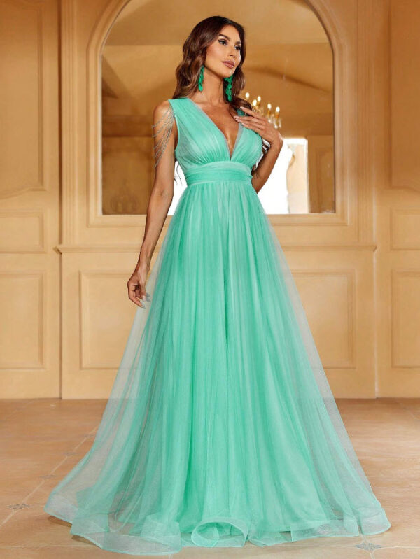 لباس دارای یقه عمیق، پشت بدون پشت و با دامن جمع‌شده است.