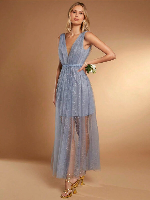 لباس با قسمت جلویی متقاطع، بندی در جلو، گردنی هالتر، پشت باز و جمعشده با بریده در قسمت ران