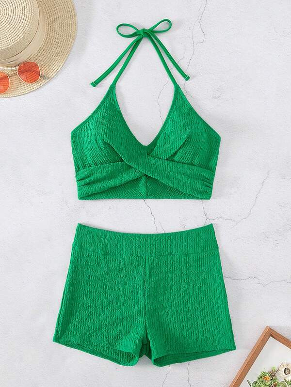 بیکینی با یقه هالتر و کمربند قابل تنظیم در جلو